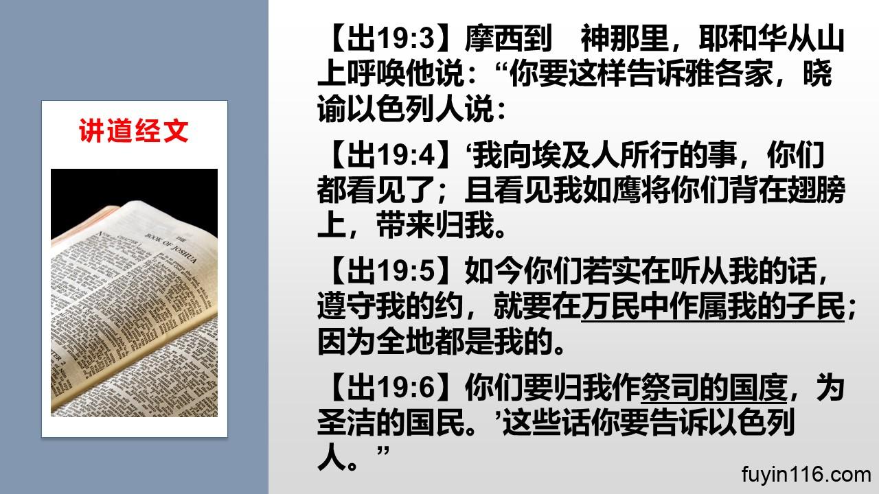 【出19:6】你们要归我作祭司的国度,为圣洁的国民。’这些话你要告诉以色列人。”