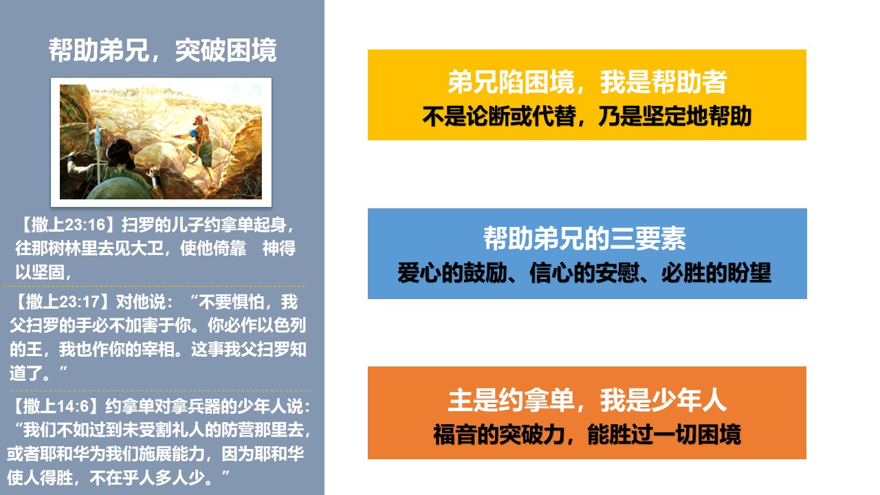 约拿单是怎样“帮助弟兄,突破困境”,给我们怎样的提醒?