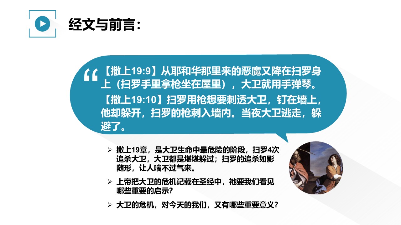 在撒母耳记上19章,记载了大卫四次躲过扫罗追杀的故事,对大卫而言,这绝对是充满危机的时期。