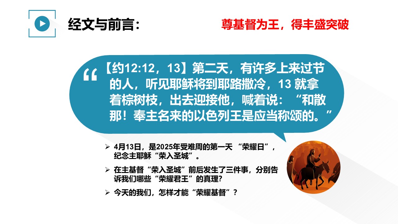 4月13日,是2025年受难周的第一天 “荣耀日”,纪念主耶稣“荣入圣城”。