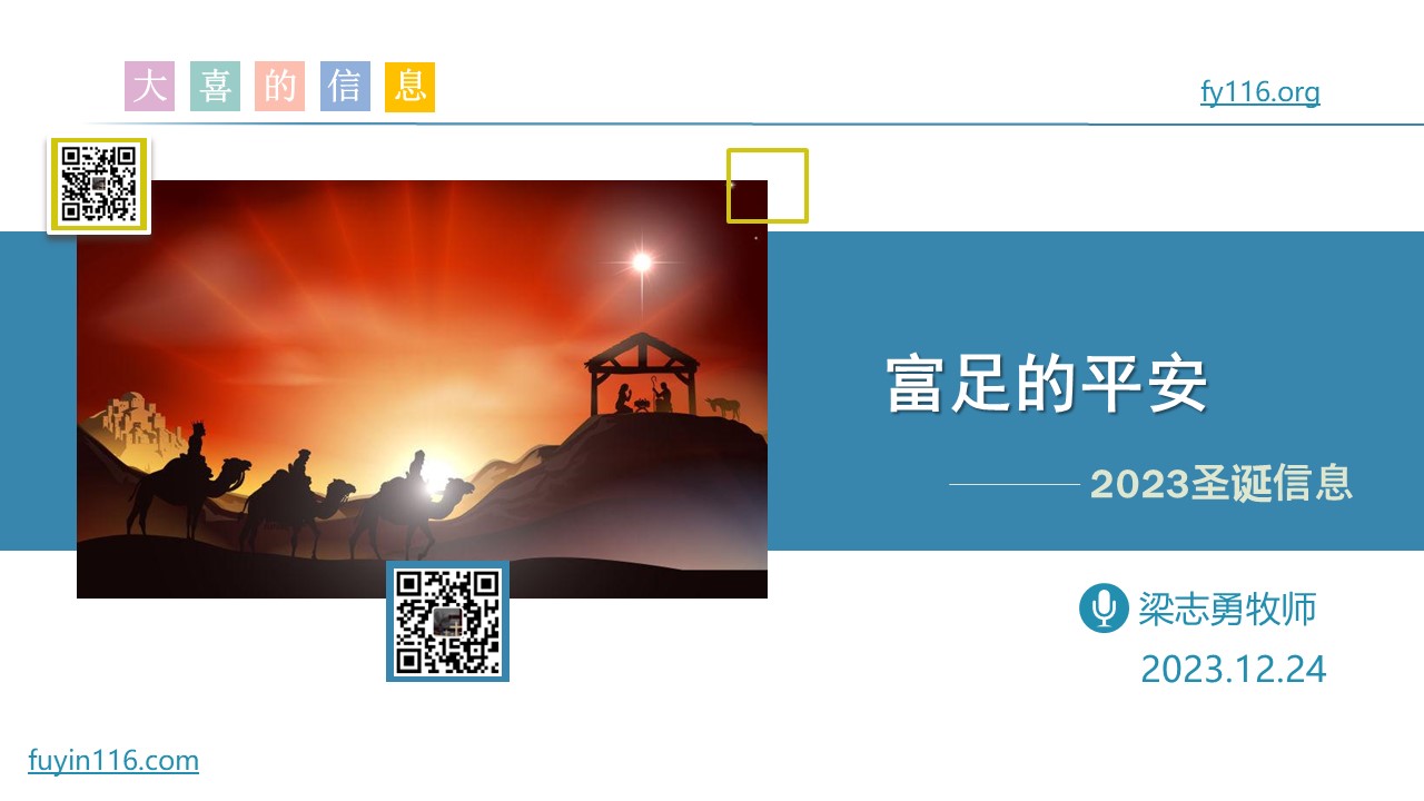 2023年12月24日,既是“平安夜”,也是主日,是我们高举基督,宣扬福音的好日子。 主赐福给我们当晚举行的福音布道会,很多在现场蒙了大福。 我们把当晚的福音布道信息整理发表出来,希望我们能像吃完“五饼二鱼”盛宴的门徒一样,把零碎收拾起来,让这“十二个篮子”的食物,继续造就更多人: “平安”对每个人都是重要的,但你知道天使是怎样谈论“平安”的吗? 你知道“真正的平安”在哪里吗? 真正的平安,和“圣诞节”有什么关系? 为什么我们说真平安一定是“富足的平安”? 我们怎样才能得到这“富足的平安”? 请听: …