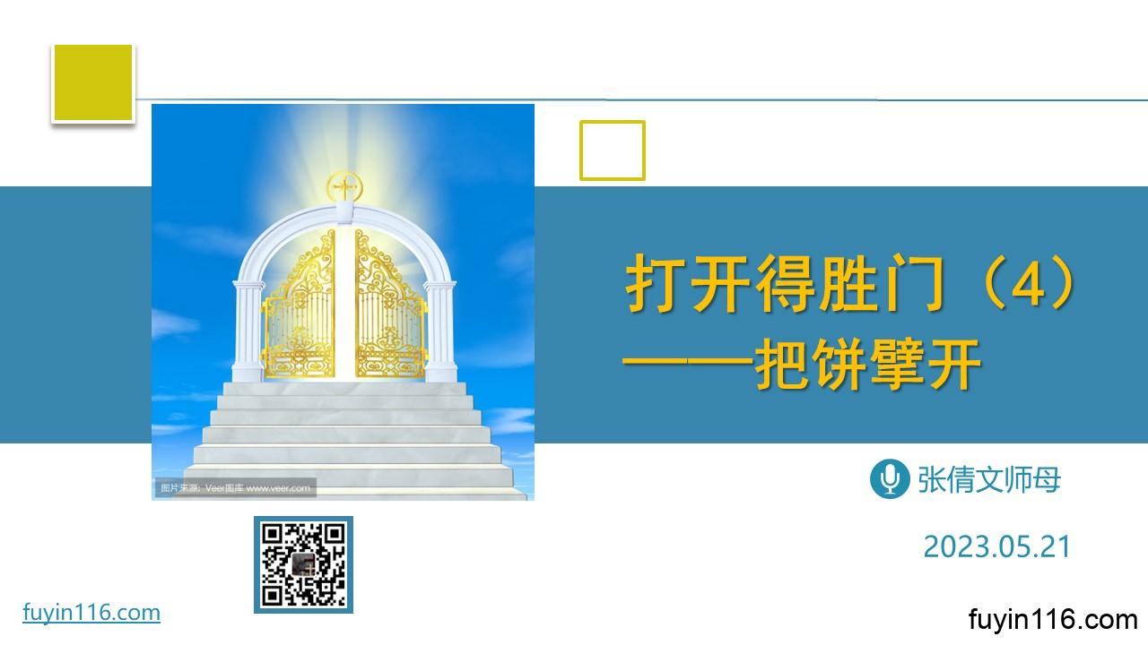 在5月21日,由倩文师母继续分享《打开得胜门》系列 《把饼擘开》 “把饼擘开”与基督的福音,有何关系? “把饼擘开”与我们的生命成长,又有何关系? “把饼擘开”对我们,有何重大意义? 愿上帝的祝福借着祂的真道,更多地临到每一个认真聆听的灵魂。 欢迎您收听: 《把饼擘开》 您也可以点击下面的链接,重温之前的信息: 《打开得胜门》系列等 点击音频媒体前面的小三角“►”就可以播放 我们的阿爸天父,感谢赞美你 感谢你赐给我们《圣经》真理,让我们可以领受你恩典和真理的祝福。 我们特别…