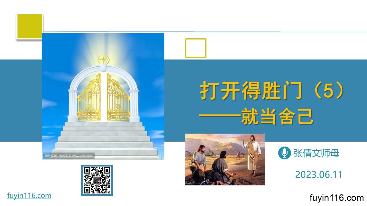 在6月11日的主日,由倩文师母继续《打开得胜门》系列的分享,第05讲: 《就当舍己》 愿上帝的祝福借着祂的真道,更多地临到每一个认真聆听的灵魂。 欢迎收听: 《就当舍己》 您也可以点击下面的链接,重温之前的信息: 《打开得胜门》系列 点击音频媒体前面的小三角“►”就可以播放 我们的阿爸天父,感谢赞美你 感谢你赐给我们《圣经》真理,让我们可以领受你恩典和真理的祝福。 我们特别感谢你,赐给我们主基督;若没有主基督,我们所做的一切都毫无价值。 但有了主基督,我们的信…